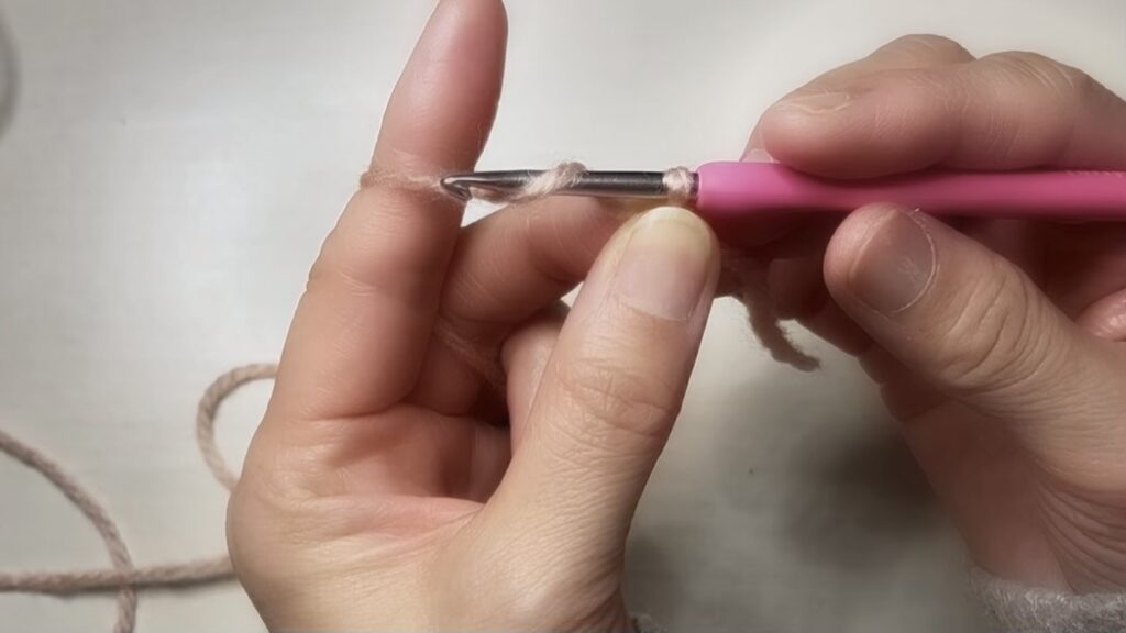 ギュッと結んでいるから、かぎ針が入らないです。絶対1目とは数えないで!