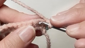 細編みで針の頭を下に向けて糸の下に針を持っていくところ